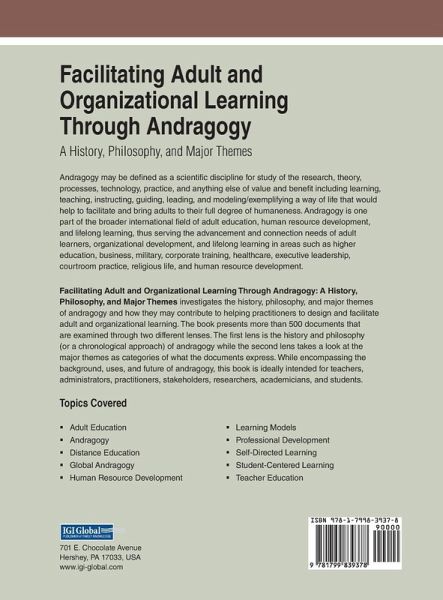 Andragogy may be defined as a scientific discipline for study of the research, theory, processes, technology, practice, and anything else of value and benefit including learning, teaching, instructing, guiding, leading, and modeling/exemplifying a way of life that would help to facilitate and bring adults to their full degree of humaneness. Andragogy is one part of the broader international field of adult education, human resource development, and lifelong learning, thus serving the advancement and connection needs of adult learners, organizational development, and lifelong learning in areas such as higher education, business, military, corporate training, healthcare, executive leadership, courtroom practice, religious life, and human resource development. Facilitating Adult and Organizational Learning Through Andragogy: A History, Philosophy, and Major Themes investigates the history, philosophy, and major themes of andragogy and how they may contribute to helping practitioners to design and facilitate adult and organizational learning. The book presents more than 500 documents that are examined through two different lenses. The first lens is the history and philosophy (or a chronological approach) of andragogy while the second lens takes a look at the major themes as categories of what the documents express. While encompassing the background, uses, and future of andragogy, this book is ideally intended for teachers, administrators, practitioners, stakeholders, researchers, academicians, and students.