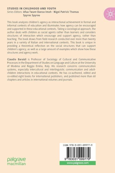 This book analyzes children's agency as interactional achievement in formal and informal contexts of education and illuminates how agency can be encouraged and supported in these educational contexts. Taking a sociological approach, the author deals with children as social agents rather than learners and considers structures of interaction which encourage and support agency, rather than teaching. The book draws from field research conducted over more than twenty years in a variety of Italian and international contexts. This book is unique in providing a theoretical reflection on the social structures that can support children's agency, as well as a large amount of examples which show how these structures and agency work.