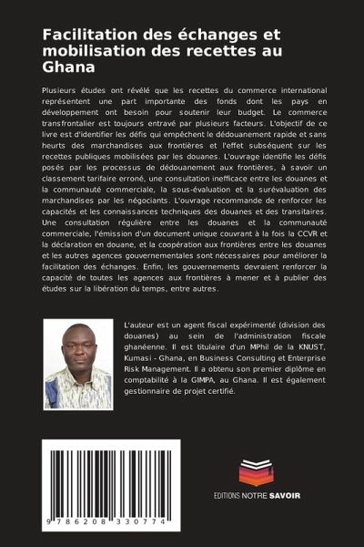 Plusieurs études ont révélé que les recettes du commerce international représentent une part importante des fonds dont les pays en développement ont besoin pour soutenir leur budget. Le commerce transfrontalier est toujours entravé par plusieurs facteurs. L'objectif de ce livre est d'identifier les défis qui empêchent le dédouanement rapide et sans heurts des marchandises aux frontières et l'effet subséquent sur les recettes publiques mobilisées par les douanes. L'ouvrage identifie les défis posés par les processus de dédouanement aux frontières, à savoir un classement tarifaire erroné, une consultation inefficace entre les douanes et la communauté commerciale, la sous-évaluation et la surévaluation des marchandises par les négociants. L'ouvrage recommande de renforcer les capacités et les connaissances techniques des douanes et des transitaires. Une consultation régulière entre les douanes et la communauté commerciale, l'émission d'un document unique couvrant à la fois la CCVR et la déclaration en douane, et la coopération aux frontières entre les douanes et les autres agences gouvernementales sont nécessaires pour améliorer la facilitation des échanges. Enfin, les gouvernements devraient renforcer la capacité de toutes les agences aux frontières à mener et à publier des études sur la libération du temps, entre autres.