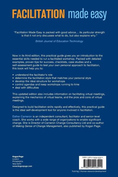 The facilitator's task of opening up discussion, getting ideas into the open and setting broad future direction is essential if a group is to reach consensus on a particular outcome and it is now one of the key techniques used in meetings and workshops. Facilitation Made Easy provides a practical introduction to the essential skills needed and will help readers develop a facilitation style that is unbiased and enables control without being overpowering. With detailed examples, proven tips for success, checklists and a self assessment guide to help readers test their own personal approach to facilitation, the book will help readers to: ¿ Understand the facilitator's role ¿ Develop the ideal structure for workshops and meetings ¿ Control agendas and help to focus the outcome of meetings ¿ Deal with difficulties. This third edition also includes a new chapter on facilitating virtual meetings, explaining the mechanics of virtual teams, the pros and cons of virtual meetings, use of technology and tips on setting up, facilitating and participating in virtual meetings
