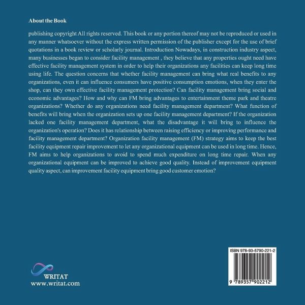 publishing copyright All rights reserved. This book or any portion thereof may not be reproduced or used in any manner whatsoever without the express written permission of the publisher except for the use of brief quotations in a book review or scholarly journal. Introduction Nowadays, in construction industry aspect, many businesses began to consider facility management , they believe that any properties ought need have effective facility management system in order to help their organizations any facilities can keep long time using life. The question concerns that whether facility management can bring what real benefits to any organizations, even it can influence consumers have positive consumption emotions, when they enter the shop, can they own effective facility management protection? Can facility management bring social and economic advantages? How and why can FM bring advantages to entertainment theme park and theatre organizations? Whether do any organizations need facility management department? What function of benefits will bring when the organization sets up one facility management department? If the organization lacked one facility management department, what the disadvantage it will bring to influence the organization's operation? Does it has relationship between raising efficiency or improving performance and facility management department? Organization facility management (FM) strategy aims to keep the best facility equipment repair improvement to let any organizational equipment can be used in long time. Hence, FM aims to help organizations to avoid to spend much expenditure on long time repair. When any organizational equipment can be improved to achieve good quality. Instead of improvement equipment quality aspect, can improvement facility equipment bring good customer emotion?