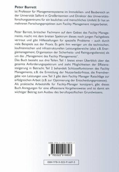 Danksagung . . . . . . . . . . . . . . . . . . . . . . . . . . . . . . . . . . . . . . . . . . . . . . . . . . . . . . . . . . . 13 Teil 1: Die Praxis des Facility Managements 1 Positive Praxisbeispiele des Facility Managements 17 1. 1 Einleitung . . . . . . . . . . . . . . . . . . . . . . . . . . . . . . . . . . . . . . . . . . . . . . . . . . . . . . . 17 1. 1. 1 Zielsetzung des Kapitels . . . . . . . . . . . . . . . . . . . . . . . . . . . . . . . . . . . . . . . 17 1. 1. 2 Überblick über die einzelnen Abschnitte . . . . . . . . . . . . . . . . . . . . . . . . . . 17 1. 1. 3 Lesearten des Kapitels . . . . . . . . . . . . . . . . . . . . . . . . . . . . . . . . . . . . . . . . . 17 1. 2 FM-Modelle . . . . . . . . . . . . . . . . . . . . . . . . . . . . . . . . . . . . . . . . . . . . . . . . . . . . . 18 1. 2. 1 Kontext. . . . . . . . . . . . . . . . . . . . . . . . . . . . . . . . . . . . . . . . . . . . . . . . . . . . . . 18 1. 2. 2 Office Manager-Modell . . . . . . . . . . . . . . . . . . . . . . . . . . . . . . . . . . . . . . . . 18 1. 2. 3 Single Site-Modell . . . . . . . . . . . . . . . . . . . . . . . . . . . . . . . . . . . . . . . . . . . . 19 1. 2. 4 Localised Sites-Modell . . . . . . . . . . . . . . . . . . . . . . . . . . . . . . . . . . . . . . . . . 20 1. 2. 5 Multiple Sites-Modell . . . . . . . . . . . . . . . . . . . . . . . . . . . . . . . . . . . . . . . . . . 20 1. 2. 6 International-Modell . . . . . . . . . . . . . . . . . . . . . . . . . . . . . . . . . . . . . . . . . . 21 1. 3 Fallstudien . . . . . . . . . . . . . . . . . . . . . . . . . . . . . . . . . . . . . . . . . . . . . . . . . . . . . . . 21 1. 3. 1 Hintergrund. . . . . . . . . . . . . . . . . . . . . . . . . . . . . . . . . . . . . . . . . . . . . . . . . . 21 1. 3. 2 OfficeManager-Modell- Beispiel . . . . . . . . . . . . . . . . . . . . . . . . . . . . . . . 22 1. 3. 3 Single Site-Modell- Beispiel 1 . . . . . . . . . . . . . . . . . . . . . . . . . . . . . . . . . . 241. 3. 4 Single Site-Modell- Beispiel 2 . . . . . . . . . . . . . . . . . . . . . . . . . . . . . . . . . . 28 1. 3. 5 Localised Sites-Modell- Beispiel . . . . . . . . . . . . . . . . . . . . . . . . . . . . . . . . 32 1. 3. 6 Multiple Sites-Modell- Beispiel 1 . . . . . . . . . . . . . . . . . . . . . . . . . . . . . . . 36 1. 3. 7 Multiple Sites- Modell - Beispiel 2 . . . . . . . . . . . . . . . . . . . . . . . . . . . . . . . 43 1. 4 FM-Systeme . . . . . . . . . . . . . . . . . . . . . . . . . . . . . . . . . . . . . . . . . . . . . . . . . . . . . 47 1. 4. 1 Hintergrund. . . . . . . . . . . . . . . . . . . . . . . . . . . . . . . . . . . . . . . . . . . . . . . . . . 47 1. 4. 2 Ergebnisse der Fallstudien . . . . . . . . . . . . . . . . . . . . . . . . . . . . . . . . . . . . . . 47 1. 4. 3 FM-Struktur . . . . . . . . . . . . . . . . . . . . . . . . . . . . . . . . . . . . . . . . . . . . . . . . . 48 1. 4. 4 Verwaltung der FM-Leistungen . . . . . . . . . . . . . . . . . . . . .. . . . . . . . . . . . 50 1. 4. 5 Abstimmung auf aktuelle Kerngeschäft-Anforderungen . . . . . . . . . . . . . 52 1. 4. 6 Facility Management und äußere Einflüsse . . . . . . . . . . . . . . . . . . . . . . . . 53 1. 5 Rahmenmodell . . . . . . . . . . . . . . . . . . . . . . . . . . . . . . . . . . . . . . . . . . . . . . . . . . . 54 1. 6 Literatur . . . . . . . . . . . . . . . . . . . . . . . . . . . . . . . . . . . . . . . . . . . . . . . . . . . . . . . . . 56 5 Inhaltsverzeichnis 2 Effizienzsteigerung des Facility Managements 57 2. 1 Einleitung . . . . . . . . . . . . . . . . . . . . . .. . . . . . . . . . . . . . . . . . . . . . . . . . . . . . . . . 57 2. 1. 1 Kontext. . . . . . . . . . . . . . . . . . . . . . . . . . . . . . . . . . . . . . . . . . . . . . . . . . . . . . 57 2. 1. 2 Hintergrund . . . . . . . . . . . . . . . . . . . . . . . . . . . . . . . . . . . . . . . . . . . . . . . . . . 57 2. 1. 3 Zusammenfassung der einzelnen Abschnitte . . . . . . . . . . . . . .. . . . . . . . 58 2