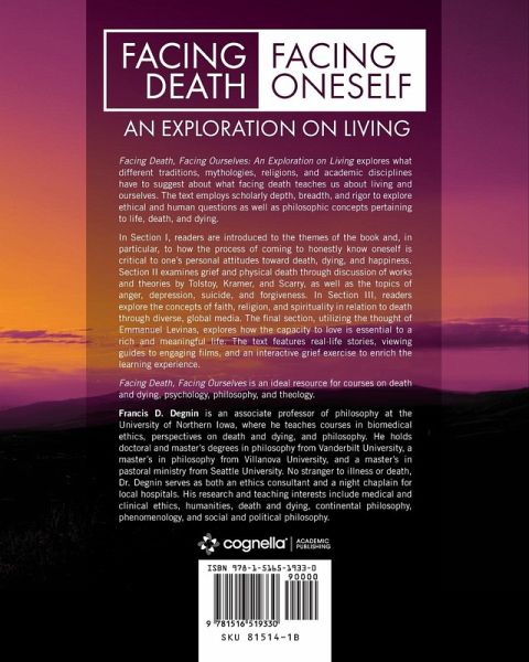 Facing Death, Facing Ourselves: An Exploration on Living explores what different traditions, mythologies, religions, and academic disciplines have to suggest about what facing death teaches us about living and ourselves. The text employs scholarly depth, breadth, and rigor to explore ethical and human questions as well as philosophic concepts pertaining to life, death, and dying. In Section I, readers are introduced to the themes of the book and, in particular, to how the process of coming to honestly know oneself is critical to one’s personal attitudes toward death, dying, and happiness. Section II examines grief and physical death through discussion of works and theories by Tolstoy, Kramer, and Scarry, as well as the topics of anger, depression, suicide, and forgiveness. In Section III, readers explore the concepts of faith, religion, and spirituality in relation to death through diverse, global media. The final section, utilizing the thought of Emmanuel Levinas, explores how the capacity to love is essential to a rich and meaningful life. The text features real-life stories, viewing guides to engaging films, and an interactive grief exercise to enrich the learning experience. Facing Death, Facing Ourselves is an ideal resource for courses on death and dying, psychology, philosophy, and theology. Francis D. Degnin is an associate professor of philosophy at the University of Northern Iowa, where he teaches courses in biomedical ethics, perspectives on death and dying, and philosophy. He holds doctoral and master’s degrees in philosophy from Vanderbilt University, a master’s in philosophy from Villanova University, and a master’s in pastoral ministry from Seattle University. No stranger to illness or death, Dr. Degnin serves as both an ethics consultant and a night chaplain for local hospitals. His research and teaching interests include medical and clinical ethics, humanities, death and dying, continental philosophy, phenomenology, and social and political philosophy.