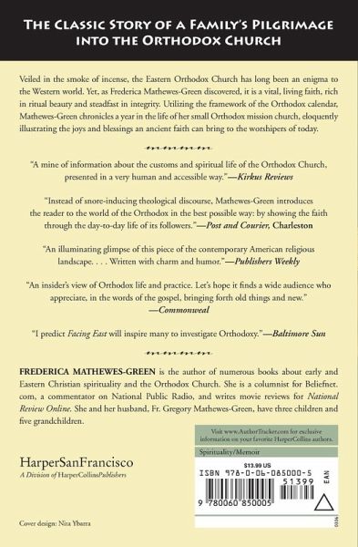 Frederica Mathewes-Green became an unexpected companion on her husband's pilgrimage into a faith that is as novel to us in the West as it is ancient in the East. Like many Americans seeking a deeper faith, Mathewes-Green and her family found in Eastern Orthodoxy a faith both demanding and offering more in true devotion and spirituality. In this luminous, affectionate, and deeply personal account of her pilgrimage, Mathewes-Green reveals a church strongly rooted in the teachings of its early fathers and a tradition of principle and great beauty that has endured throughout the centuries. Following the framework of the Orthodox calendar - from Lent to Pascha to Nativity, from Vespers to feasts to fasts - Mathewes-Green chronicles a year in the life of her small Orthodox mission church. Discovering the splendor and solemnity of Orthodox ritual, exploring the daunting majesty of Orthodox services and customs, and sharing their daily anxieties, disappointments, and delights, the Mathewes-Green family and the members of the Holy Cross Mission Church reveal both the intricacies of Orthodox belief and the deep joy they have found in their new faith. At once entertaining, hilarious, and reverent, Facing East is an unforgettable portrait of the human vitality and divine essence of Eastern Orthodoxy.