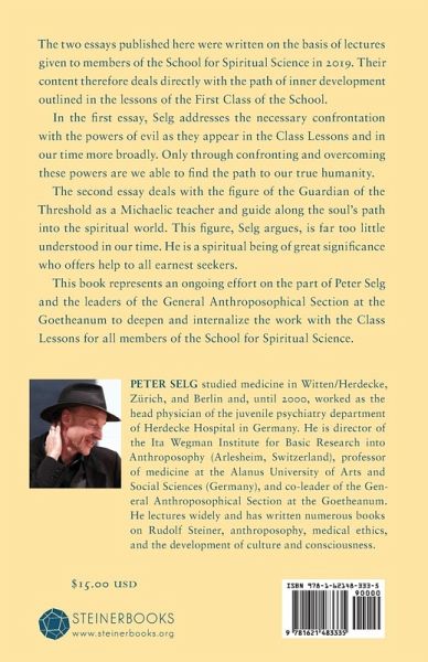 "We, the people of the fifth post-Atlantean period...we have to resolve, to the greatest extent possible and in a way that is filled with the power of life, the problem that one can call the problem of evil. I ask you to think about this in some depth. The fact that evil, which will approach the human being of the fifth post-Atlantean period in every possible form and will do this in such a way that the human being will have to resolve the very nature and being of evil scientifically, will have to come to grips, in all his or her loving and hating, with everything that stems from evil, and battle and wrestle with evil's resistance to impulses of the will; all this belongs to the task of the fifth post-Atlantean period." -- Rudolf Steiner , Goethe's Faust in the Light of Anthroposophy, p. 85 The two essays published here were written on the basis of lectures given to members of the School for Spiritual Science. Their content therefore deals directly with the path of inner development outlined in the lessons of the First Class of the School. In the first essay, Selg address the necessary confrontation with the powers of evil as they appear in the Class Lessons and in our time more broadly. Only through confronting and overcoming these powers are we able to find the path to our true humanity. The second essay deals with the figure of the Guardian of the Threshold as a Michaelic teacher and guide along the soul's path into the spiritual world. This figure, Selg argues, is far too little understood in our time. He is a spiritual being of great significance who offers help to all earnest seekers. This book represents an ongoing effort on the part of Peter Selg and the leaders of the General Anthroposophical Section at the Goetheanum to deepen and internalize the work with the Class Lessons for all members of the School for Spiritual Science. This book is comprised of translations of texts originally published in German by Verlag des Ita Wegman Instituts: Die Auseinandersetzung mit dem Bösen: Zur Schulung der ' Ersten Klasse '. Hochschulvorträge Band 1 (2019); Die Sprache des Hüters: Zur Schulung der ' Ersten Klasse '. Hochschulvorträge Band 2 (2020).
