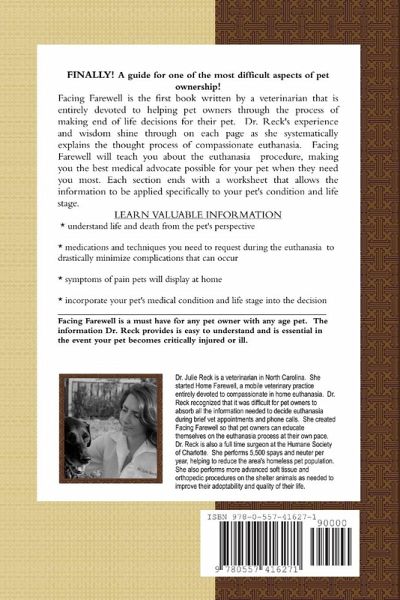 When is it the right time? Does it hurt my pet? How do I measure my pet's quality of life? How do I know if they are in pain? There are finally answers! Facing Farewell is the first book created by a veterinarian that is entirely devoted to helping pet owners make euthanasia decisions for their pets. You will learn how to time end of life decisions based specifically on your pet's medical condition. You will learn the best methods and techniques of compassionate euthanasia so you can be an informed medical advocate for your pet. You will be able to recognize the symptoms of animal pain and understand how to set parameters to define your pet's quality of life. Each chapter concludes with worksheets to apply the information specifically to you and your pet. Facing Farewell is a necessary book for any dog or cat owner wishing to be prepared to make the best decisions possible for their pet when they will need it the most.