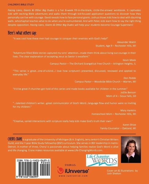 Facing Lions, Giants & Other Big Dudes is a fun 8-week fill-in-the-blank, circle-the-answer workbook. It captivates kids with exciting Bible adventures and walks them through kid-focused application questions to discover how they personally can live with courage. David reveals how to face personal giants. Joshua shows kids how to deal with daunting walls. Jehoshaphat teaches what to do when you're outnumbered. And with Peter, kids learn how to say the right thing despite opposition. Facing Lions, Giants & Other Big Dudes will help your students become Courage Superstars! Here's what others say: "It was cool how these men had courage to conquer their enemies with God's help!" Alexander Walsh Student, Age 9 - Rochester Hills, MI "Adventure-filled Bible stories captured my sons' attention...made them think about living out courage in their lives. Loved the clear explanation of accepting Jesus as Savior." Kevin Meek Campus Pastor - The Orchard Evangelical Free Church - Arlington Heights, IL "This series is great...one-of-a-kind...I love how scripture's presented, discussed, reviewed and applied to everyday life." Don Pedde Campus Pastor - Woodside Bible Church - Warren, MI "It'd be great if churches got hold of this series and made books available for children in the summer." JoElle Benson Mom of 4 - Sioux Falls, SD "...talented children's writer...great communicator of God's Word...language flow and humor were so inviting for my children." Mary Hankins Homeschool Mom - Rochester Hills, MI "Creative, varied interactions with scripture really help kids make God's truth their own." Karen Shive Family Counselor - Oakland, MI