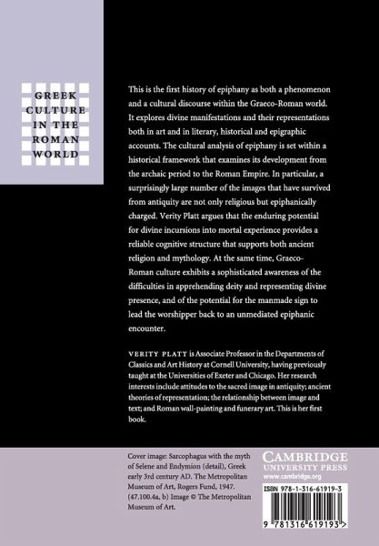 This is the first history of epiphany as both a phenomenon and a cultural discourse within the Graeco-Roman world. It explores divine manifestations and their representations both in art and in literary, historical and epigraphic accounts. The cultural analysis of epiphany is set within a historical framework that examines its development from the archaic period to the Roman Empire. In particular, a surprisingly large number of the images that have survived from antiquity are not only religious but epiphanically charged. Verity Platt argues that the enduring potential for divine incursions into mortal experience provides a reliable cognitive structure that supports both ancient religion and mythology. At the same time, Graeco-Roman culture exhibits a sophisticated awareness of the difficulties in apprehending deity and representing divine presence, and of the potential for the manmade sign to lead the worshipper back to an unmediated epiphanic encounter.