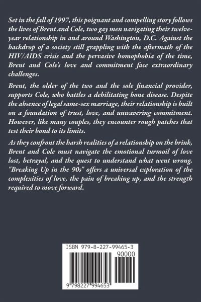 Set in the fall of 1997, this poignant and compelling story follows the lives of Brent and Cole, two gay men navigating their twelve-year relationship in and around Washington, D.C. Against the backdrop of a society still grappling with the aftermath of the HIV/AIDS crisis and the pervasive homophobia of the time, Brent and Cole's love and commitment face extraordinary challenges. Brent, the older of the two and the sole financial provider, supports Cole, who battles a debilitating bone disease. Despite the absence of legal same-sex marriage, their relationship is built on a foundation of trust, love, and unwavering commitment. However, like many couples, they encounter rough patches that test their bond to its limits. As they confront the harsh realities of a relationship on the brink, Brent and Cole must navigate the emotional turmoil of love lost, betrayal, and the quest to understand what went wrong. "Breaking Up in the 90s" offers a universal exploration of the complexities of love, the pain of breaking up, and the strength required to move forward. Join Brent and Cole on their journey through the highs and lows of love, as they face their past and struggle to find a way forward in a world that is slowly beginning to accept them.
