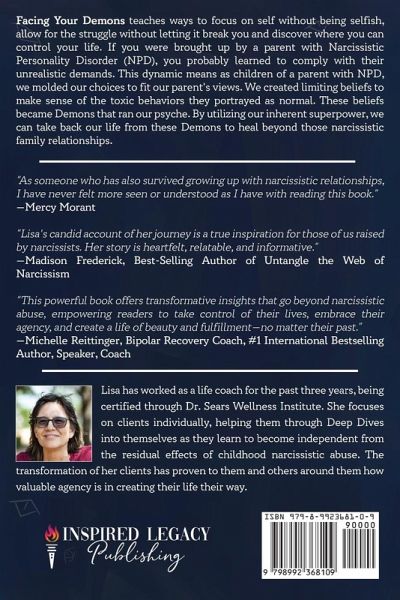 Growing up under the regime of a narcissistic parent is uniquely difficult. Once becoming an adult, the biggest problem is recognizing why it is different. Being born under this parenting style makes it seem normal rather than abusive. With ninja- like skills, the narcissist convinces the world that you are the problem. In this self-help book, Lisa shares how she finally navigated the lies, manipulations and twisted thinking that was trained into her as regular. If you grew up with a narcissistic parent, this book will help you. In it you can learn how to focus on self without being selfish, allow for the struggle to exist without breaking you and take back control of your life from those Demons who are currently running it. This book can help you discover who you truly are as you reclaim your superpower. Knowing how to identify the changes you need allows you the ability to realize them as you learn how to fit your individual needs. You are not wrong or broken and it is possible to finally heal. As you recognize the needs that were not filled by your caretakers, you can learn to find healthy ways to fill them. Confidence emerges as you learn to set healthy boundaries with self and others. Though everyone's journey is unique, the similarities you will read about in this book will become clear as you navigate out of that toxic relationship with your caretaker. You can learn to create your life your way, discovering your remarkable uniqueness along the way. Your brilliant survival skills that were learned under gaslighting, constant criticism, and maybe even physical abuse helped you survive. You may not have had safety growing up but you can design that safety in the life you choose to create now.
