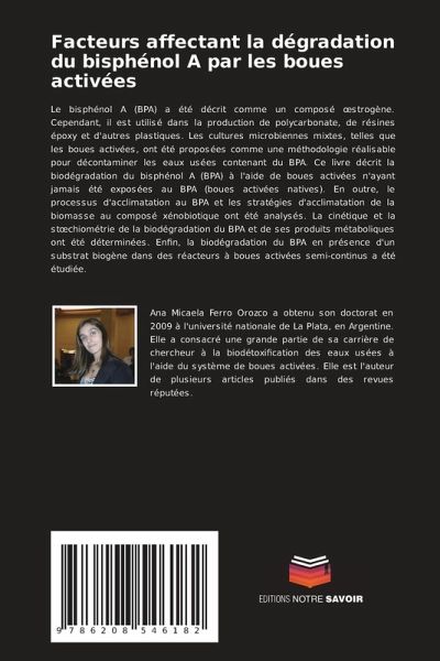 Le bisphénol A (BPA) a été décrit comme un composé oestrogène. Cependant, il est utilisé dans la production de polycarbonate, de résines époxy et d'autres plastiques. Les cultures microbiennes mixtes, telles que les boues activées, ont été proposées comme une méthodologie réalisable pour décontaminer les eaux usées contenant du BPA. Ce livre décrit la biodégradation du bisphénol A (BPA) à l'aide de boues activées n'ayant jamais été exposées au BPA (boues activées natives). En outre, le processus d'acclimatation au BPA et les stratégies d'acclimatation de la biomasse au composé xénobiotique ont été analysés. La cinétique et la stoechiométrie de la biodégradation du BPA et de ses produits métaboliques ont été déterminées. Enfin, la biodégradation du BPA en présence d'un substrat biogène dans des réacteurs à boues activées semi-continus a été étudiée.