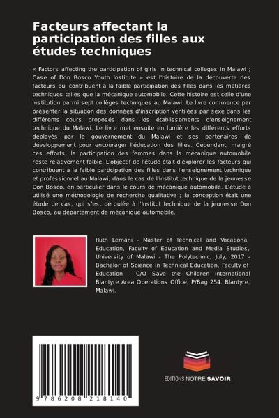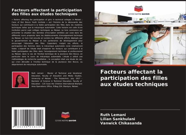 « Factors affecting the participation of girls in technical colleges in Malawi ; Case of Don Bosco Youth Institute » est l'histoire de la découverte des facteurs qui contribuent à la faible participation des filles dans les matières techniques telles que la mécanique automobile. Cette histoire est celle d'une institution parmi sept collèges techniques au Malawi. Le livre commence par présenter la situation des données d'inscription ventilées par sexe dans les différents cours proposés dans les établissements d'enseignement technique du Malawi. Le livre met ensuite en lumière les différents efforts déployés par le gouvernement du Malawi et ses partenaires de développement pour encourager l'éducation des filles. Cependant, malgré ces efforts, la participation des femmes dans la mécanique automobile reste relativement faible. L'objectif de l'étude était d'explorer les facteurs qui contribuent à la faible participation des filles dans l'enseignement technique et professionnel au Malawi, dans le cas de l'Institut technique de la jeunesse Don Bosco, en particulier dans le cours de mécanique automobile. L'étude a utilisé une méthodologie de recherche qualitative ; la conception était une étude de cas, qui s'est déroulée à l'Institut technique de la jeunesse Don Bosco, au département de mécanique automobile.