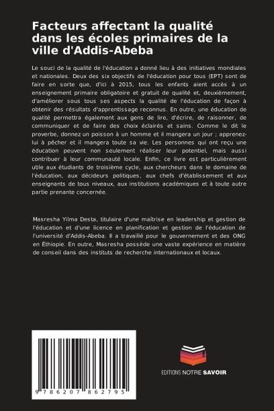 Le souci de la qualité de l'éducation a donné lieu à des initiatives mondiales et nationales. Deux des six objectifs de l'éducation pour tous (EPT) sont de faire en sorte que, d'ici à 2015, tous les enfants aient accès à un enseignement primaire obligatoire et gratuit de qualité et, deuxièmement, d'améliorer sous tous ses aspects la qualité de l'éducation de façon à obtenir des résultats d'apprentissage reconnus. En outre, une éducation de qualité permettra également aux gens de lire, d'écrire, de raisonner, de communiquer et de faire des choix éclairés et sains. Comme le dit le proverbe, donnez un poisson à un homme et il mangera un jour ; apprenez-lui à pêcher et il mangera toute sa vie. Les personnes qui ont reçu une éducation peuvent non seulement réaliser leur potentiel, mais aussi contribuer à leur communauté locale. Enfin, ce livre est particulièrement utile aux étudiants de troisième cycle, aux chercheurs dans le domaine de l'éducation, aux décideurs politiques, aux chefs d'établissement et aux enseignants de tous niveaux, aux institutions académiques et à toute autre partie prenante concernée.