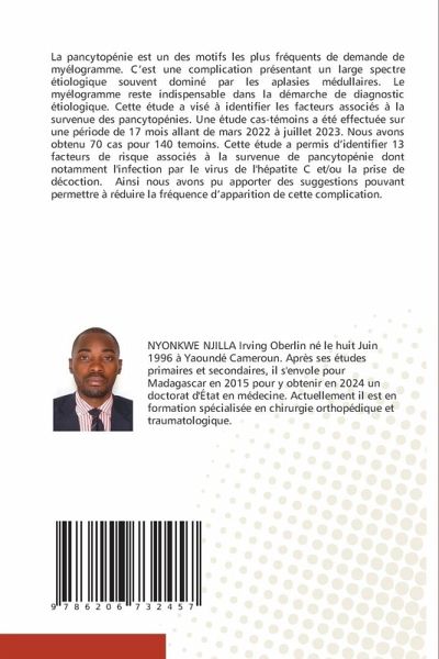 La pancytopénie est un des motifs les plus fréquents de demande de myélogramme. C'est une complication présentant un large spectre étiologique souvent dominé par les aplasies médullaires. Le myélogramme reste indispensable dans la démarche de diagnostic étiologique. Cette étude a visé à identifier les facteurs associés à la survenue des pancytopénies. Une étude cas-témoins a été effectuée sur une période de 17 mois allant de mars 2022 à juillet 2023. Nous avons obtenu 70 cas pour 140 temoins. Cette étude a permis d'identifier 13 facteurs de risque associés à la survenue de pancytopénie dont notamment l'infection par le virus de l'hépatite C et/ou la prise de décoction. Ainsi nous avons pu apporter des suggestions pouvant permettre à réduire la fréquence d'apparition de cette complication.