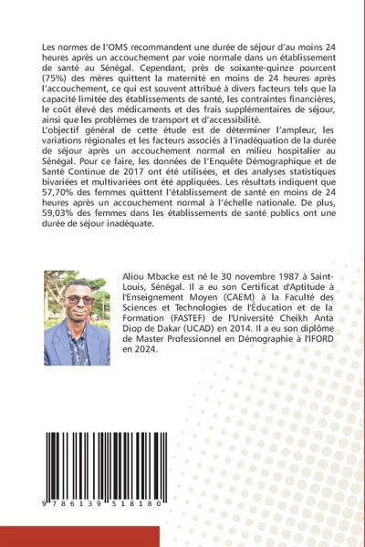 Les normes de l'OMS recommandent une durée de séjour d'au moins 24 heures après un accouchement par voie normale dans un établissement de santé au Sénégal. Cependant, près de soixante-quinze pourcent (75%) des mères quittent la maternité en moins de 24 heures après l'accouchement, ce qui est souvent attribué à divers facteurs tels que la capacité limitée des établissements de santé, les contraintes financières, le coût élevé des médicaments et des frais supplémentaires de séjour, ainsi que les problèmes de transport et d'accessibilité.L'objectif général de cette étude est de déterminer l'ampleur, les variations régionales et les facteurs associés à l'inadéquation de la durée de séjour après un accouchement normal en milieu hospitalier au Sénégal. Pour ce faire, les données de l'Enquête Démographique et de Santé Continue de 2017 ont été utilisées, et des analyses statistiques bivariées et multivariées ont été appliquées. Les résultats indiquent que 57,70% des femmes quittent l'établissement de santé en moins de 24 heures après un accouchement normal à l'échelle nationale. De plus, 59,03% des femmes dans les établissements de santé publics ont une durée de séjour inadéquate.