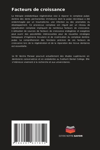 La thérapie endodontique régénérative vise à réparer le complexe pulpe-dentine des dents permanentes immatures dont la pulpe nécrotique a été endommagée par un traumatisme, une infection ou des anomalies du développement. Ce processus complexe est régulé par un réseau de signalisation complexe impliquant de nombreux facteurs de croissance. L'utilisation de sources de facteurs de croissance endogènes et exogènes peut ouvrir des possibilités intéressantes pour de nouvelles stratégies biologiques d'ingénierie tissulaire et de cicatrisation du complexe dentine-pulpe. La compréhension des fonctions précises de ces facteurs de croissance lors de la régénération et de la réparation des tissus dentaires est essentielle.