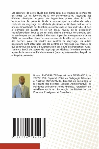Les résultats de cette étude ont élargi ceux des travaux de recherches existantes sur les facteurs de la non-performance du recyclage des déchets plastiques. A partir des hypothèses posées dans la partie introductive, la présente étude a montré que la chaîne de valeur verticale du recyclage des déchets plastiques à Kinshasa fait ressortir une incompatibilité des fonctions assumées par un seul individu. Et puis le contrôle de qualité ne se fait qu'au niveau de la production (transformation). Pour ce qui est de la chaîne de valeur horizontale, ceci ne semble pas encore existée à Kinshasa. A part les ménages et certaines ONG qui travaillent dans l'assainissement de la ville, et qui collectent des déchets pour les vendre aux centres de recyclage, les autres opérations sont effectuées par les centres de recyclage eux-mêmes ce qui contribue en outre à l'augmentation des coûts de production. Ainsi, l'analyse SWOT du secteur de recyclage des déchets faite dans ce travail a permis de connaitre l'environnement (interne, externe) dans lequel ces entreprises oeuvrent.