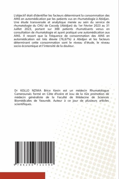 L'objectif était d'identifier les facteurs déterminant la consommation des AINS en automédication par les patients vus en rhumatologie à Abidjan. Une étude transversale et analytique menée au sein du service de rhumatologie du CHU de Cocody (Abidjan) du 1er Février 2023 au 31 Juillet 2023, portant sur 388 patients rhumatisants venus en consultation de rhumatologie et ayant pratiqué une automédication aux AINS. Il ressort que la fréquence de consommation des AINS en automédication est très élevée (76,67%) à Abidjan et les facteurs déterminant cette consommation sont le niveau d'étude, le niveau socio-économique et l'intensité de la douleur.