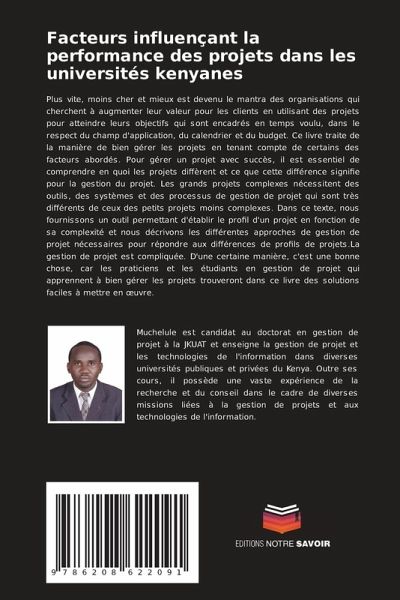 Plus vite, moins cher et mieux est devenu le mantra des organisations qui cherchent à augmenter leur valeur pour les clients en utilisant des projets pour atteindre leurs objectifs qui sont encadrés en temps voulu, dans le respect du champ d'application, du calendrier et du budget. Ce livre traite de la manière de bien gérer les projets en tenant compte de certains des facteurs abordés. Pour gérer un projet avec succès, il est essentiel de comprendre en quoi les projets diffèrent et ce que cette différence signifie pour la gestion du projet. Les grands projets complexes nécessitent des outils, des systèmes et des processus de gestion de projet qui sont très différents de ceux des petits projets moins complexes. Dans ce texte, nous fournissons un outil permettant d'établir le profil d'un projet en fonction de sa complexité et nous décrivons les différentes approches de gestion de projet nécessaires pour répondre aux différences de profils de projets.La gestion de projet est compliquée. D'une certaine manière, c'est une bonne chose, car les praticiens et les étudiants en gestion de projet qui apprennent à bien gérer les projets trouveront dans ce livre des solutions faciles à mettre en oeuvre.