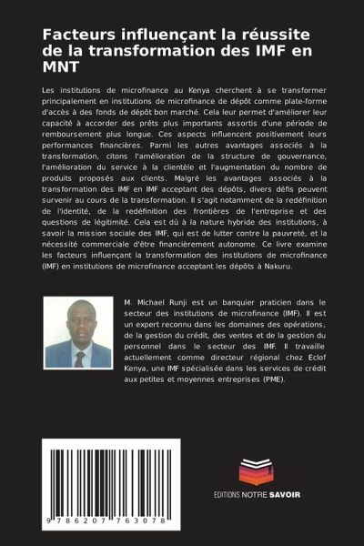 Les institutions de microfinance au Kenya cherchent à se transformer principalement en institutions de microfinance de dépôt comme plate-forme d'accès à des fonds de dépôt bon marché. Cela leur permet d'améliorer leur capacité à accorder des prêts plus importants assortis d'une période de remboursement plus longue. Ces aspects influencent positivement leurs performances financières. Parmi les autres avantages associés à la transformation, citons l'amélioration de la structure de gouvernance, l'amélioration du service à la clientèle et l'augmentation du nombre de produits proposés aux clients. Malgré les avantages associés à la transformation des IMF en IMF acceptant des dépôts, divers défis peuvent survenir au cours de la transformation. Il s'agit notamment de la redéfinition de l'identité, de la redéfinition des frontières de l'entreprise et des questions de légitimité. Cela est dû à la nature hybride des institutions, à savoir la mission sociale des IMF, qui est de lutter contre la pauvreté, et la nécessité commerciale d'être financièrement autonome. Ce livre examine les facteurs influençant la transformation des institutions de microfinance (IMF) en institutions de microfinance acceptant les dépôts à Nakuru.