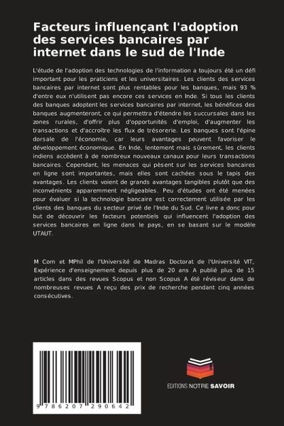 L'étude de l'adoption des technologies de l'information a toujours été un défi important pour les praticiens et les universitaires. Les clients des services bancaires par internet sont plus rentables pour les banques, mais 93 % d'entre eux n'utilisent pas encore ces services en Inde. Si tous les clients des banques adoptent les services bancaires par internet, les bénéfices des banques augmenteront, ce qui permettra d'étendre les succursales dans les zones rurales, d'offrir plus d'opportunités d'emploi, d'augmenter les transactions et d'accroître les flux de trésorerie. Les banques sont l'épine dorsale de l'économie, car leurs avantages peuvent favoriser le développement économique. En Inde, lentement mais sûrement, les clients indiens accèdent à de nombreux nouveaux canaux pour leurs transactions bancaires. Cependant, les menaces qui pèsent sur les services bancaires en ligne sont importantes, mais elles sont cachées sous le tapis des avantages. Les clients voient de grands avantages tangibles plutôt que des inconvénients apparemment négligeables. Peu d'études ont été menées pour évaluer si la technologie bancaire est correctement utilisée par les clients des banques du secteur privé de l'Inde du Sud. Ce livre a donc pour but de découvrir les facteurs potentiels qui influencent l'adoption des services bancaires en ligne dans le pays, en se basant sur le modèle UTAUT.