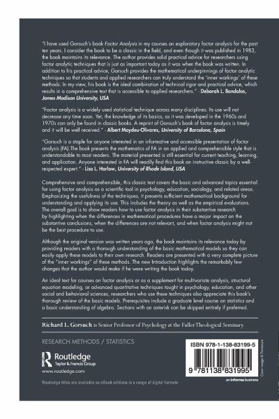 Comprehensive and comprehensible, this classic text covers the basic and advanced topics essential for using factor analysis as a scientific tool in psychology, education, sociology, and related areas. Emphasizing the usefulness of the techniques, it presents sufficient mathematical background for understanding and applying its use. This includes the theory as well as the empirical evaluations. The overall goal is to show readers how to use factor analysis in their substantive research by highlighting when the differences in mathematical procedures have a major impact on the substantive conclusions, when the differences are not relevant, and when factor analysis might not be the best procedure to use. Although the original version was written years ago, the book maintains its relevance today by providing readers with a thorough understanding of the basic mathematical models so they can easily apply these models to their own research. Readers are presented with a very complete picture of the "inner workings" of these methods. The new Introduction highlights the remarkably few changes that the author would make if he were writing the book today. An ideal text for courses on factor analysis or as a supplement for multivariate analysis, structural equation modeling, or advanced quantitative techniques taught in psychology, education, and other social and behavioral sciences, researchers who use these techniques also appreciate this book's thorough review of the basic models. Prerequisites include a graduate level course on statistics and a basic understanding of algebra. Sections with an asterisk can be skipped entirely if preferred.