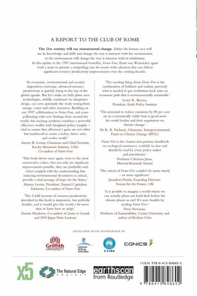 When first published in 1997, Factor Four: Doubling Wealth, Halving Resource Use by renowned economic and engineering experts Ernst von Weizsäcker, Amory Lovins and L. Hunter Lovins, transformed how economists, policy makers, engineers, entrepreneurs and business leaders thought about innovation and wealth creation. Through examples from a wide range of industrial sectors, the authors demonstrated how technical innovation could cut resource use in half while doubling wealth. Now twelve years on, with climate change at the top of the world agenda and the new economic giants of China and India needing ever more resources, there is a unique historic opportunity to scale up resources productivity and radically transform the global economy. And Factor Five is the book set to change all of this. Picking up where Factor Four left off, this new book examines the past 15 years of innovation in industry, technical innovation and policy. It shows how and where factor four gains have been made and how we can achieve greater factor five or 80%+ improvements in resource and energy productivity and how to roll them out on a global scale to retool our economic system, massively boost wealth for billions of people around the world and help solve the climate change crises. Spanning dozens of countries including China and India and examining innumerable cases of innovation in design, technology and policy, the authors leave no engineering and economic stone unturned in their quest for excellence. The book tackles sustainable development and climate change by providing in depth Factor 5 resource productivity studies of the following sectors: Buildings, Industry, Agriculture, Food and Hospitality, and Transportation. In its systematic approach to demonstrating how Factor 5 can be achieved, the book also provides an overview of energy/water nexus and energy/materials nexus efficiency opportunities across these sectors. Given that these sectors are responsible for virtually all energy usage and greenhouse gas emissions globally, this book is designed to guide everyone from individual households, businesses, industry sector groups to national governments in their efforts to achieve the IPCC recommended target of 80 per cent reductions to greenhouse gas emissions. It also looks at innovation in regulation to increase resource productivity, pricing, carbon trading, eco-taxation and permits and the role of international institutions and trade. The authors also explain exciting new concepts such as bio-mimicry and whole system design, as hallmarks for a new generation of technologies. The last part of the book explores transformative ideas such as a long term trajectory of gently rising energy and resource prices, and new concepts of well-being in a more equitable world. Like its predecessor this book is simply the most important work on the future of innovation, business, economics and policy and is top drawer reading for leaders across all sectors including business and industry, government, engineering and design and teaching. This book is full colour throughout. Published with The Natural Edge Project