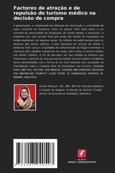 A globalização, a simplicidade de obtenção de informação e a facilidade de viajar cortaram as fronteiras entre os países. Este facto levou a um aumento da necessidade de instalações de saúde rápidas e acessíveis. A Indonésia tem uma grande área que ainda não dispõe de instalações de saúde equitativas em algumas zonas. Os bilhetes de avião baratos para os destinos dos países vizinhos, a boa reputação em termos de saúde, a distância mais curta e a facilidade de compreensão da língua aumentam o interesse dos cidadãos indonésios em viajar, bem como o turismo médico nos países vizinhos. A fim de descobrir em que medida os factores que influenciam a decisão de uma pessoa de realizar turismo médico na Malásia foram apresentados sob a forma de um livro baseado nos resultados da investigação sobre o trabalho final de licenciatura em turismo, intitulado PUSH AND PULL FACTORS FOR MEDICAL TOURISM AND PURCHASE DECISION FOR INDONESIAN TOURISTS' (CASE STUDY: AT GLENEAGLES HOSPITAL IN PENANG, MALAYSIA).