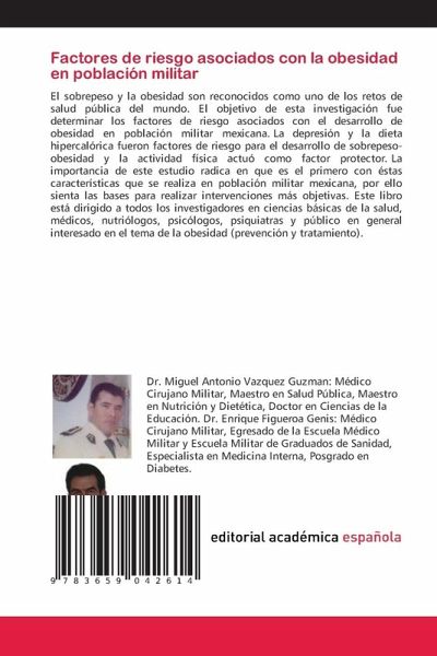El sobrepeso y la obesidad son reconocidos como uno de los retos de salud pública del mundo. El objetivo de esta investigación fue determinar los factores de riesgo asociados con el desarrollo de obesidad en población militar mexicana. La depresión y la dieta hipercalórica fueron factores de riesgo para el desarrollo de sobrepeso-obesidad y la actividad física actuó como factor protector. La importancia de este estudio radica en que es el primero con éstas características que se realiza en población militar mexicana, por ello sienta las bases para realizar intervenciones más objetivas. Este libro está dirigido a todos los investigadores en ciencias básicas de la salud, médicos, nutriólogos, psicólogos, psiquiatras y público en general interesado en el tema de la obesidad (prevención y tratamiento).