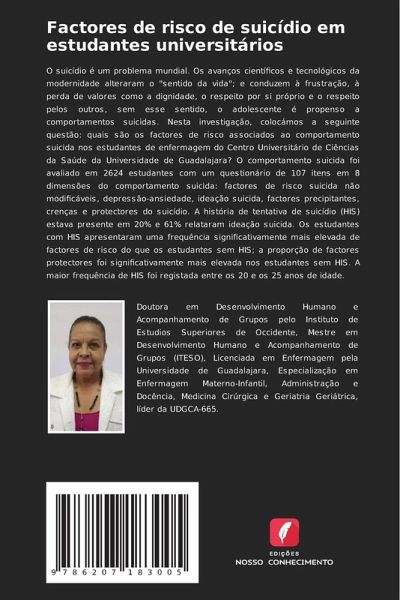 O suicídio é um problema mundial. Os avanços científicos e tecnológicos da modernidade alteraram o "sentido da vida"; e conduzem à frustração, à perda de valores como a dignidade, o respeito por si próprio e o respeito pelos outros, sem esse sentido, o adolescente é propenso a comportamentos suicidas. Nesta investigação, colocámos a seguinte questão: quais são os factores de risco associados ao comportamento suicida nos estudantes de enfermagem do Centro Universitário de Ciências da Saúde da Universidade de Guadalajara? O comportamento suicida foi avaliado em 2624 estudantes com um questionário de 107 itens em 8 dimensões do comportamento suicida: factores de risco suicida não modificáveis, depressão-ansiedade, ideação suicida, factores precipitantes, crenças e protectores do suicídio. A história de tentativa de suicídio (HIS) estava presente em 20% e 61% relataram ideação suicida. Os estudantes com HIS apresentaram uma frequência significativamente mais elevada de factores de risco do que os estudantes sem HIS; a proporção de factores protectores foi significativamente mais elevada nos estudantes sem HIS. A maior frequência de HIS foi registada entre os 20 e os 25 anos de idade.