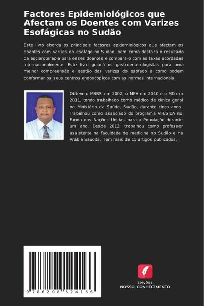 Este livro aborda os principais factores epidemiológicos que afectam os doentes com varizes do esófago no Sudão, bem como destaca o resultado da escleroterapia para esses doentes e compara-o com as taxas acordadas internacionalmente. Este livro guiará os gastroenterologistas para uma melhor compreensão e gestão das varizes do esófago e como podem conformar os seus centros endoscópicos com as normas internacionais.
