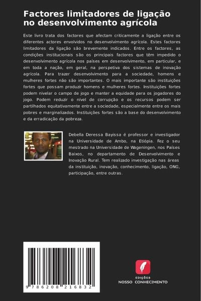 Este livro trata dos factores que afectam criticamente a ligação entre os diferentes actores envolvidos no desenvolvimento agrícola. Estes factores limitadores da ligação são brevemente indicados. Entre os factores, as condições institucionais são os principais factores que têm impedido o desenvolvimento agrícola nos países em desenvolvimento, em particular, e em toda a nação, em geral, na perspetiva dos sistemas de inovação agrícola. Para trazer desenvolvimento para a sociedade, homens e mulheres fortes não são importantes. O mais importante são instituições fortes que possam produzir homens e mulheres fortes. Instituições fortes podem nivelar o campo de jogo e manter a equidade para os jogadores do jogo. Podem reduzir o nível de corrupção e os recursos podem ser partilhados equitativamente entre a sociedade, especialmente entre os mais pobres e marginalizados. Instituições fortes são a base do desenvolvimento e da erradicação da pobreza.