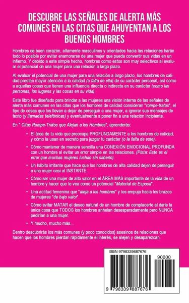 Descubre las Señales de Advertencia Más Comunes en las Citas que Ahuyentan a los Buenos Hombres >Debido a esto, hombres como estos son MUY selectivos al evaluar el potencial de una mujer para una relación a largo plazo. Y no dudarán en descartar a una mujer una vez que se den cuenta de que en realidad no es "Material de Novia" y, por lo tanto, no vale la pena su tiempo y atención. Descubre los factores ocultos que los hombres utilizan para determinar si vale la pena salir con una mujer. >La cuestión es que, después de que una mujer haya superado la prueba de apariencia física de un hombre, evaluará su nivel de química con él (la forma en que él se siente a su lado). Y una vez que un hombre se da cuenta de que tiene suficiente química con una mujer, con el tiempo evaluará lentamente varios aspectos de su carácter para determinar si, de hecho, vale la pena salir con ella para un amor a largo plazo y tal vez incluso el matrimonio. Cómo Evitar Alejar a los Hombres y Finalmente Conseguir la Relación que Deseas >Este libro fue diseñado para brindar a las mujeres una visión interna de cómo piensan los hombres y qué quieren los hombres en una mujer cuando están listos para una relación seria. En él, verás las cosas desde el punto de vista de un hombre, mientras descubres los diversos aspectos de la vida y el comportamiento de una mujer que podrían hacer que un hombre pierda interés en ella y desaparezca sin dejar rastro. Esto es lo que aprenderás en el interior: * El área de tu vida que preocupa PROFUNDAMENTE a los hombres de calidad, y cómo la usan en secreto para juzgar tu carácter (o la falta de este). * Cómo mantener de manera sencilla una CONEXIÓN EMOCIONAL PROFUNDA con un hombre al evitar un error simple en las relaciones. * Un hábito irritante que hace que los hombres de alta calidad dejen de perseguir a una mujer casi al INSTANTE. * Cómo ser una mujer de alto valor en el ÁREA MÁS importante de la vida de un hombre y hacer que te vea como un potencial "Material de Esposa". * Una actitud femenina que "aleja a los hombres" y los empuja hacia los brazos de mujeres "de bajo valor". * Cómo evitar MATAR el deseo natural de un hombre de complacerte al darle la única cosa que TODOS los hombres anhelan desesperadamente pero NUNCA pedirían a una mujer. * Y mucho, mucho más... ¿Te gustaría saber más? >Ve hacia arriba de la página y selecciona