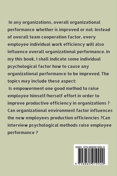 In any organizations, overall organizational performance whether is improved or not. Instead of overall team cooperation factor, every employee individual work efficiency will also influence overall organizational performance. In my this book, I shall indicate some individual psychological factor how to cause any organizational performance to be improved. The topics may include these aspect: Is empowerment one good method to raise employee himself/herself effort in order to improve productive efficiency in organizations ? Can organizational environment factor influences the new employees production efficiencies ?Can interview psychological methods raise employee performance ? Has close relationship between employee satisfaction and work motivation ? What does organization system theory mean ? What is human resource department and organizational performance relationship ?Can technological inputs factor influence construction industry performance ? Can effective departmental communication factor influence organizational performance ? Can performance measurement influence effectiveness ?