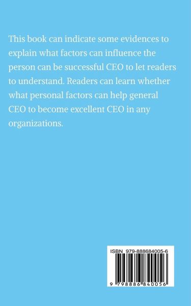 Can any one be one successful CEO? If it is not, what are the unique personal characteristics between one general CEO and one successful CEO ? Instead of personal characteristics, which kinds of skills to any successful CEOs, they will need? Why do some CEOs encounter fail to manage themselves companies? Why do some CEOs feel difficulties to manage themselves companies? This book can indicate some evidences to explain what factors can influence the person can be successful CEO to let readers to understand. Readers can learn whether what personal factors can help general CEO to become excellent CEO in any organizations.