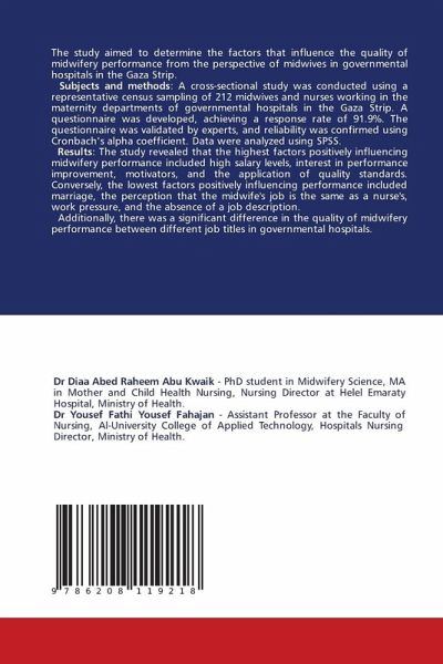 The study aimed to determine the factors that influence the quality of midwifery performance from the perspective of midwives in governmental hospitals in the Gaza Strip. Subjects and methods: A cross-sectional study was conducted using a representative census sampling of 212 midwives and nurses working in the maternity departments of governmental hospitals in the Gaza Strip. A questionnaire was developed, achieving a response rate of 91.9%. The questionnaire was validated by experts, and reliability was confirmed using Cronbach's alpha coefficient. Data were analyzed using SPSS. Results: The study revealed that the highest factors positively influencing midwifery performance included high salary levels, interest in performance improvement, motivators, and the application of quality standards. Conversely, the lowest factors positively influencing performance included marriage, the perception that the midwife's job is the same as a nurse's, work pressure, and the absence of a job description. Additionally, there was a significant difference in the quality of midwifery performance between different job titles in governmental hospitals.