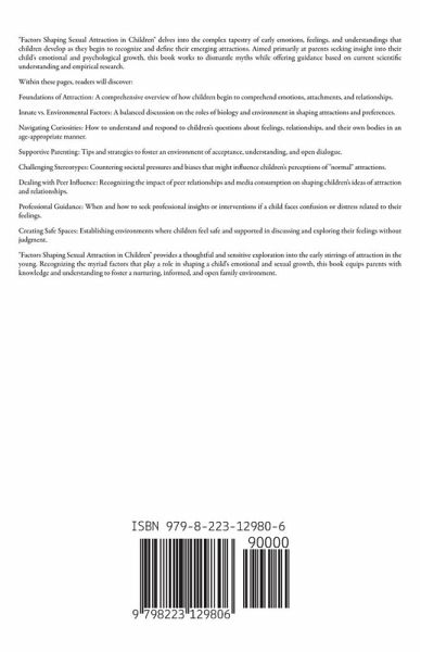 "Factors Shaping Sexual Attraction in Children" delves into the complex tapestry of early emotions, feelings, and understandings that children develop as they begin to recognize and define their emerging attractions. Aimed primarily at parents seeking insight into their child's emotional and psychological growth, this book works to dismantle myths while offering guidance based on current scientific understanding and empirical research. Within these pages, readers will discover: Foundations of Attraction: A comprehensive overview of how children begin to comprehend emotions, attachments, and relationships. Innate vs. Environmental Factors: A balanced discussion on the roles of biology and environment in shaping attractions and preferences. Navigating Curiosities: How to understand and respond to children's questions about feelings, relationships, and their own bodies in an age-appropriate manner. Supportive Parenting: Tips and strategies to foster an environment of acceptance, understanding, and open dialogue. Challenging Stereotypes: Countering societal pressures and biases that might influence children's perceptions of "normal" attractions. Dealing with Peer Influence: Recognizing the impact of peer relationships and media consumption on shaping children's ideas of attraction and relationships. Professional Guidance: When and how to seek professional insights or interventions if a child faces confusion or distress related to their feelings. Creating Safe Spaces: Establishing environments where children feel safe and supported in discussing and exploring their feelings without judgment. "Factors Shaping Sexual Attraction in Children" provides a thoughtful and sensitive exploration into the early stirrings of attraction in the young. Recognizing the myriad factors that play a role in shaping a child's emotional and sexual growth, this book equips parents with knowledge and understanding to foster a nurturing, informed, and open family environment.