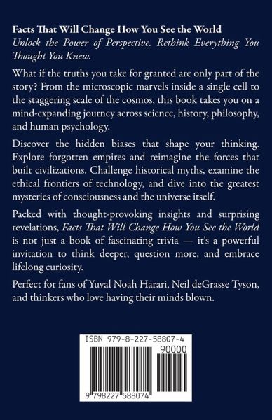Facts That Will Change How You See the World Unlock the Power of Perspective. Rethink Everything You Thought You Knew. What if the truths you take for granted are only part of the story? From the microscopic marvels inside a single cell to the staggering scale of the cosmos, this book takes you on a mind-expanding journey across science, history, philosophy, and human psychology. Discover the hidden biases that shape your thinking. Explore forgotten empires and reimagine the forces that built civilizations. Challenge historical myths, examine the ethical frontiers of technology, and dive into the greatest mysteries of consciousness and the universe itself. Packed with thought-provoking insights and surprising revelations, Facts That Will Change How You See the World is not just a book of fascinating trivia - it's a powerful invitation to think deeper, question more, and embrace lifelong curiosity. Perfect for fans of Yuval Noah Harari, Neil deGrasse Tyson, and thinkers who love having their minds blown.