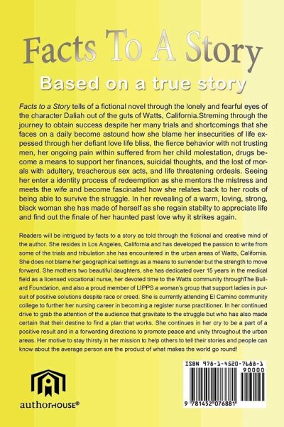 Facts to a Story tells of a fictional novel through the lonely and fearful eyes of the character "Daliah" out of the guts of Watts, California. Puzzling through her journey to obtain success despite her many trials and shortcomings; become astound how she blames insecurities of life through her defiant love triangles. Her fierce behavior of guilt, ongoing pain, suffered childhood, and means to use drugs to support her, versus the lost of morals with adultery, treacherous sex acts, and life threatening ordeals. The amazing ways she enters a identity process of redeemption as she mentors the mistress and meets the wife. Watch the fancinating dialogue as she reach back to her roots to endure the struggle. Daliah introduces a warm, loving, strong black woman when she regains stability to appreciate life and the finale of her haunted past love strikes again!