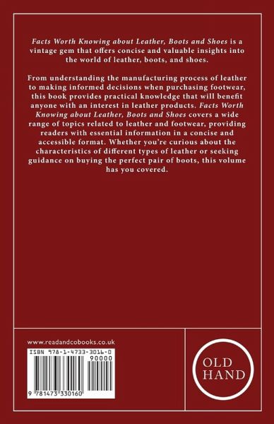 This vintage book contains some concise but useful facts about leather, boots, and shoes. Although old, much of the information contained within this volume is timeless and will be of considerable utility to modern readers. From the manufacturing of leather to things to consider when buying leather boots, this volume contains information that will benefit those with an interest in leather footwear. Contents include: "Hide Dealers", "Leather Manufacturers", "Character of Leather", "Shoddy", "Effect of Oil on Leather", "Description of Cuts", "Cost of Making goods", "A 'Good Fit' Desirable", "What Boots to Buy", "We Sell to Jobbers Only", and "One Hundred Dollars Reward". Many vintage books such as this are increasingly scarce and expensive. We are republishing this volume now in an affordable, modern edition complete with a specially commissioned new introduction on leather crafting. First published in 1872.