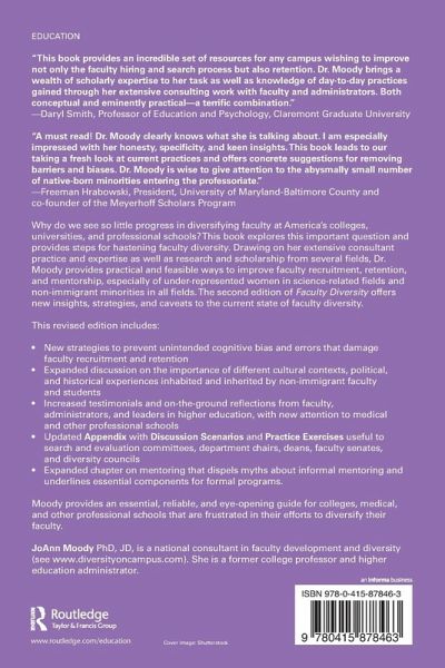 Why do we see so little progress in diversifying faculty at America's colleges, universities, and professional schools? This book explores this important question and provides steps for hastening faculty diversity. Drawing on her extensive consultant practice and expertise as well as research and scholarship from several fields, Dr. Moody provides practical and feasible ways to improve faculty recruitment, retention, and mentorship, especially of under-represented women in science-related fields and non-immigrant minorities in all fields. The second edition of Faculty Diversity offers new insights, strategies, and caveats to the current state of faculty diversity. This revised edition includes:¿ New strategies to prevent unintended cognitive bias and errors that damage faculty recruitment and retention Expanded discussion on the importance of different cultural contexts, political, and historical experiences inhabited and inherited by non-immigrant faculty and students Increased testimonials and on-the-ground reflections from faculty, administrators, and leaders in higher education, with new attention to medical and other professional schools Updated Appendix with Discussion Scenarios and Practice Exercises useful to search and evaluation committees, department chairs, deans, faculty senates, and diversity councils Expanded chapter on mentoring that dispels myths about informal mentoring and underlines essential components for formal programs. Moody provides an essential, reliable, and eye-opening guide for colleges, medical, and other professional schools that are frustrated in their efforts to diversify their faculty.