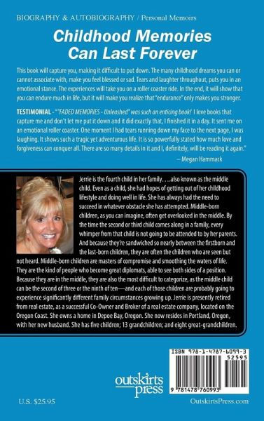 This book will capture you, making it difficult to put down. The many childhood dreams you can or cannot associate with, make you feel blessed or sad. Tears and laughter throughout, puts you in an emotional stance. The experiences will take you on a roller coaster ride. In the end, it will show that you can endure much in life, but it will make you realize that "endurance" only makes you stronger. TESTIMONIAL - ""FADED MEMORIES - Unleashed" was such an enticing book! I love books that capture me and don't let me put it down and it did exactly that, I finished it in a day. It sent me on an emotional roller coaster. One moment I had tears running down my face to the next page, I was laughing. It shows such a tragic yet adventurous life. It is so powerfully stated how much love and forgiveness can conquer all. There are so many details in it and I, definitely, will be reading it again." - Megan Hammack