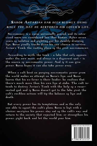 Saros Antarian has been slowly dying since the day he restored his lover's life. Necromancy is a curse universally feared, and its ostracized users are considered less than human. After seven years of isolation and fighting for his steadily-draining life, Saros finally tracks down his one chance to survive: Jovian's Tomb, the resting place of the first necromancer. According to myth, the tomb - a lake that only appears under the new moon, and always in a different spot - is the source of necromantic power. And if it can give power, Saros hopes it can also take power away. When a cult bent on purging necromantic power from the world makes an attempt on Saros's life, and Saros learns that his ex-lover is their leader, he realizes that there's much more than his own life at stake. The cult intends to destroy Jovian's Tomb with the help of a resurrected god, and if Saros doesn't get to the lake first, the cult's reckless actions will tip the balance of life and death. But every power has its temptations, and as the only one able to offset the cult's plans, Saros is left with a choice: sacrifice his power, stay out of the cult's way, and return to the society that rejected him; or strengthen his power, fight back, and let the world fear him.