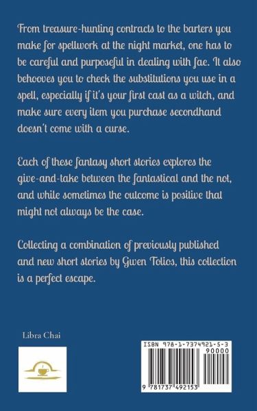 From treasure-hunting contracts to the barters you make for spellwork at the night market, one has to be careful and purposeful in dealing with fae. It also behooves you to check the substitutions you use in a spell, especially if it's your first cast as a witch, and make sure every item you purchase secondhand doesn't come with a curse. Each of these fantasy short stories explores the give-and-take between the fantastical and the not, and while sometimes the outcome is positive that might not always be the case. Collecting a combination of previously published and new short stories by Gwen Tolios, this collection is a perfect escape.