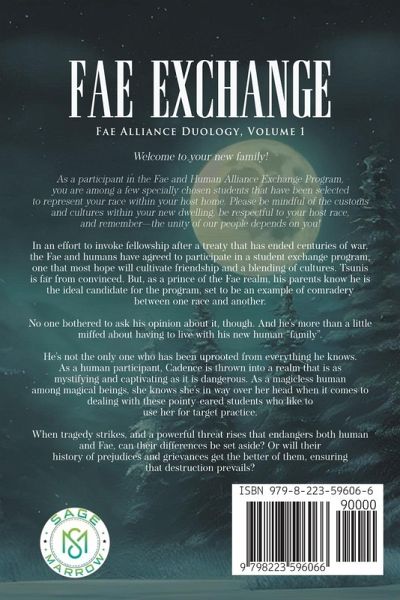 Welcome to your new family! As a participant in the Fae and Human Alliance Exchange Program, you are among a few specially chosen students that have been selected to represent your race within your host home. Please be mindful of the customs and cultures within your new dwelling, be respectful to your host race, and remember—the unity of our people depends on you! In an effort to invoke fellowship after a treaty that has ended centuries of war, the Fae and humans have agreed to participate in a student exchange program, one that most hope will cultivate friendship and a blending of cultures. Tsunis is far from convinced. But, as a prince of the Fae realm, his parents know he is the ideal candidate for the program, set to be an example of comradery between one race and another. No one bothered to ask his opinion about it, though. And he's more than a little miffed about having to live with his new human "family". He's not the only one who has been uprooted from everything he knows. As a human participant, Cadence is thrown into a realm that is as mystifying and captivating as it is dangerous. As a magicless human among magical beings, she knows she's in way over her head when it comes to dealing with these pointy-eared students who like to use her for target practice. When tragedy strikes, and a powerful threat rises that endangers both human and Fae, can their differences be set aside? Or will their history of prejudices and grievances get the better of them, ensuring that destruction prevails?