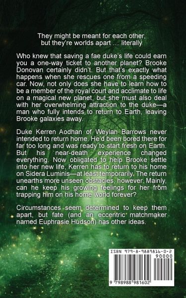 They might be meant for each other, but they're worlds apart ... literally Who knew that saving a fae duke's life could earn you a one-way ticket to another planet? Brooke Donovan certainly didn't. But that's exactly what happens when she rescues one from a speeding car. Now, not only does she have to learn how to be a member of the royal court and acclimate to life on a magical new planet, but she must also deal with her overwhelming attraction to the duke-a man who fully intends to return to Earth, leaving Brooke galaxies away. Duke Kerren Aodhan of Weylan Barrows never intended to return home. He'd been bored there for far too long and was ready to start fresh on Earth. But his near-death experience changed everything. Now obligated to help Brooke settle into her new life, Kerren has to return to his home on Sidera Luminis-at least temporarily. The return unearths more unseen obstacles, however. Mainly, can he keep his growing feelings for her from trapping him on his home world forever? Circumstances seem determined to keep them apart, but fate (and an eccentric matchmaker named Euphrasie Hudson) has other ideas.