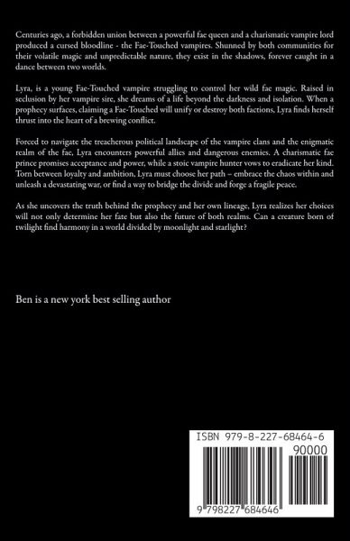 Centuries ago, a forbidden union between a powerful fae queen and a charismatic vampire lord produced a cursed bloodline - the Fae-Touched vampires. Shunned by both communities for their volatile magic and unpredictable nature, they exist in the shadows, forever caught in a dance between two worlds. Lyra, is a young Fae-Touched vampire struggling to control her wild fae magic. Raised in seclusion by her vampire sire, she dreams of a life beyond the darkness and isolation. When a prophecy surfaces, claiming a Fae-Touched will unify or destroy both factions, Lyra finds herself thrust into the heart of a brewing conflict. Forced to navigate the treacherous political landscape of the vampire clans and the enigmatic realm of the fae, Lyra encounters powerful allies and dangerous enemies. A charismatic fae prince promises acceptance and power, while a stoic vampire hunter vows to eradicate her kind. Torn between loyalty and ambition, Lyra must choose her path - embrace the chaos within and unleash a devastating war, or find a way to bridge the divide and forge a fragile peace. As she uncovers the truth behind the prophecy and her own lineage, Lyra realizes her choices will not only determine her fate but also the future of both realms. Can a creature born of twilight find harmony in a world divided by moonlight and starlight?