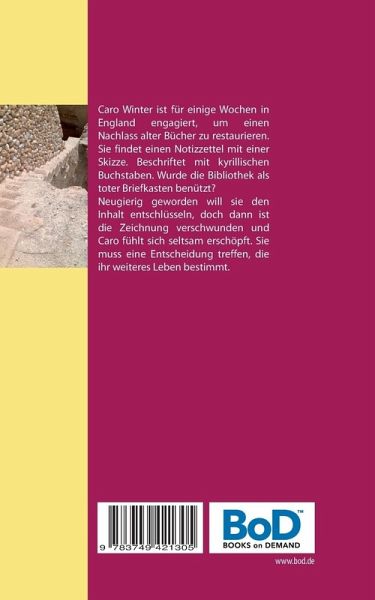 Caro Winter ist für einige Wochen in England engagiert, um für einen Sammler einen Nachlass alter Bücher zu restaurieren. In einer alten Ausgabe von Beowulf findet sie einen Notizzettel mit einer Skizze. Datiert mit 1982 und beschriftet mit kyrillischen Buchstaben. Hat im kalten Krieg jemand eine Bibliothek als toten Briefkasten benützt?Neugierig geworden will sie den Inhalt entschlüsseln, doch dann ist die Zeichnung verschwunden und Caro fühlt sich seltsam erschöpft. Eine ärztliche Untersuchung bringt eine unerwartete Diagnose und Caro wird mit grundsätzlichen Fragen konfrontiert. Sie muss eine Entscheidung treffen, die ihr ganzes weiteres Leben bestimmt.