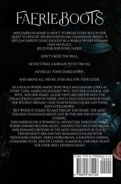 Miss Emerlyn Adair is about to break every rule in her quest to rescue her beloved feline companion, Boots. If she can survive long enough in a world where humans have no place. Rules for Surviving Faerie: Don't cross The Wall. Never strike a bargain with the fae. Never let your guard down. And above all, never, ever fall for your guide. In a realm where magic runs wild and danger lurks at every turn, Emerlyn's journey will test her courage, her wits, and her heart. As she ventures deeper into the treacherous land of Faerie, she'll face challenges beyond her wildest dreams-and temptations unlike anything she's ever known. But when it comes to matters of the heart, the most perilous challenge might just be the one she never saw coming. Join Emerlyn on a whimsical adventure through Faerie, where enemies become allies, unexpected creatures roam, and romance blooms in the most dangerous of places. This Regency-era fantasy romance is filled with frolicking faeries, fierce hobgoblins, a ravenous undine, charming elves, and of course, a magical unicorn. Ready for your next favorite read?