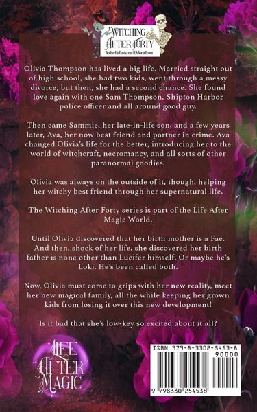 Olivia Thompson has lived a big life. Married straight out of high school, she had two kids, went through a messy divorce, but then, she had a second chance. She found love again with one Sam Thompson, Shipton Harbor police officer and all around good guy. Then came Sammie, her late-in-life son, and a few years later, Ava, her now best friend and partner in crime. Ava changed Olivia's life for the better, introducing her to the world of witchcraft, necromancy, and all sorts of other paranormal goodies. Olivia was always on the outside of it, though, helping her witchy best friend through her supernatural life. The Witching After Forty series is part of the Life After Magic World. Until Olivia discovered that her birth mother is a Fae. And then, shock of her life, she discovered her birth father is none other than Lucifer himself. Or maybe he's Loki. He's been called both. Now, Olivia must come to grips with her new reality, meet her new magical family, all the while keeping her grown kids from losing it over this new development! Is it bad that she's low-key so excited about it all?